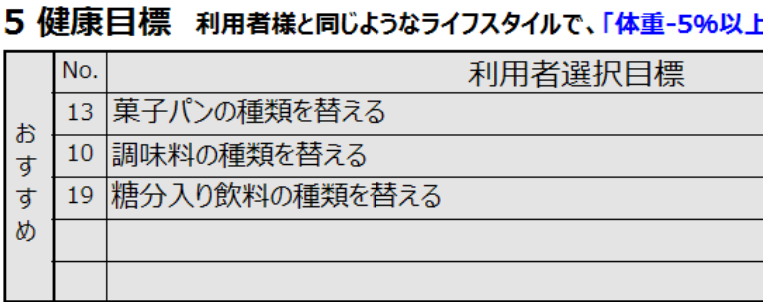 利用者選択目標を確認し、具体的な取り組み内容を利用者とすり合わせの上、健康目標を決定しましょう。