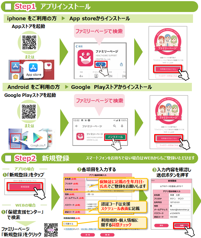ファミリーページの登録方法iPhoneの場合Androidの場合WEB版をお使いの場合iPhoneの場合インストールの流れ①iPhoneの方は「App store」を開き、「ファミリーページ」を検索する②アイコン右横の「入手」...