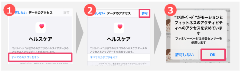 ※ファミリーページと連携できるのは、ヘルスケアとGoogle fitのみです。歩数はファミリーページアプリを閉じていても計測されます。